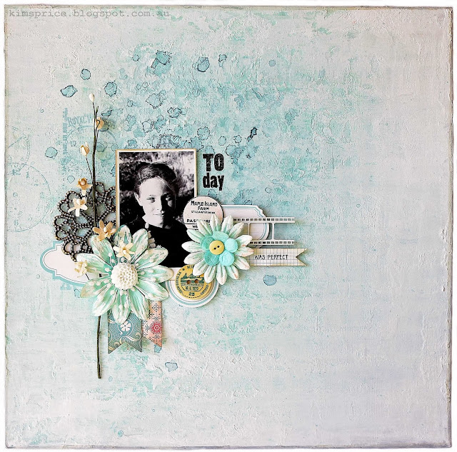 Was mir an dieser Seite besonders gefiel waren die zarten Farben, die gesamte Komposition, der gemalte Hintergrund, die beiden Fähnchen unterhalb des Fotos, and wie alles so hübsch um das Foto herum drapiert wurde. Und diese waren die Grundlage für meine Seite: